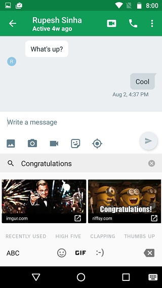 كما هو الحال مع تطبيق فيسبوك ماسنجر، أدرجت جوجل في تطبيقها Gboard مُحرك بحث للصور المُتحركة GIF التي أصبح استخدامها شائعاً جداً في الفترة الأخيرة ومُستخدمة بشكل كبير أثناء المُحادثات لإضفاء واقعية وبعض المرح مع أصدقائك.