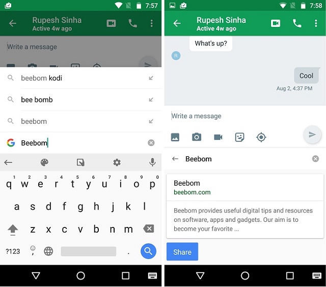 ويمكنك مشاركة نتائج البحث من لوحة مفاتيح Gboard مع أصدقائك عبر عدة تطبيقات المُراسلة مثل واتساب وفيسبوك ماسنجر والمزيد عندما تقوم بالضغط على زر البحث G لتظهر لك نافذة مُصغّرة لبحث جوجل.