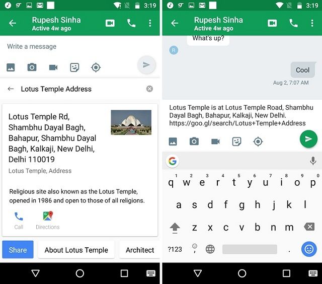 ويمكنك الاستمتاع بمزايا بحث جوجل ومشاركة العناوين والإتجاهات وكُل ما عليك فعله، أن تكتب إسم المكان المقصود مثل المطاعم والأماكن الشهيرة والبحث عنه وستظهر لك بيانات الخرائط ووسائل الإتصال الخاصة به ويُمكنك إرسالها لأي شخص مُتواجد في قائمة الإتصال لديك.