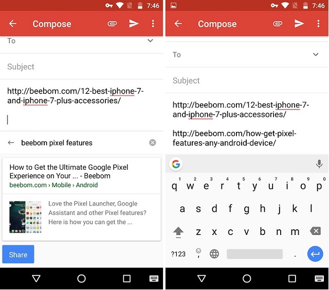 بعد التحديث الأخير لتطبيق Gboard، أصبح من السهل مشاركة الروابط بطريقة بسيطة دون الحاجة لنقل الرابط من التطبيقات الأخرى ويُمكنك البحث عن عنوان المقال أو الصفحة الذي تريد مشاركتها وكتابة اسم الموقع بجانب العنوان وستظهر لك عدة روابط وفيديوهات من الويب، ويُمكنك مشاركة أي رابط بالضغط على زر Share بدلاً من الخروج من الصفحة.
