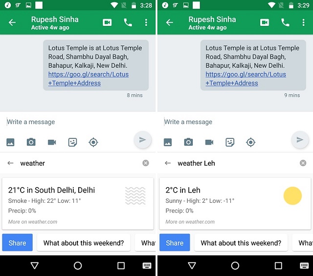 يُمكنك مشاركة حالة الطقس بكتابة كلمة Weather ويليها إسم المكان الذي تُريد عرض معلومات الطقس الخاصة به وستظهر لك حالة الطقس بتصميم تفاعلي ويُمكنك مشاركتها مع الأصدقاء.