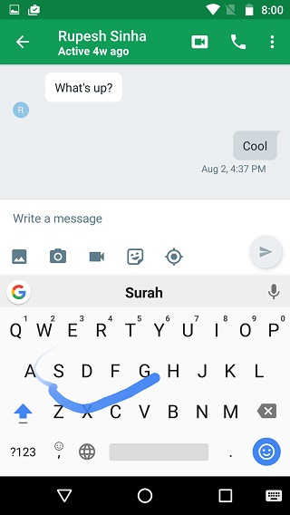 خاصية glide typing تسمح لك بالكتابة عبر حركة الإصبع فوق الحروف بطريقة سلسة دون الحاجة للنقر على كل زر بشكل مُنفصل وسيتوقّع التطبيق الكلمات التي تُريد أن تكتبها أثناء الحركة.