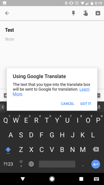 قامت جوجل بإطلاق تحديثٍ جديد للنسخة التجريبية لتطبيق لوحة المفاتيح الخاص بها G.board والذي جلب معه عدة ميزات هامة، أهمها التكامل مع تطبيق Google Translate بما يمكن المستخدمين من ترجمة النصوص بشكلٍ فوريّ وسريع.